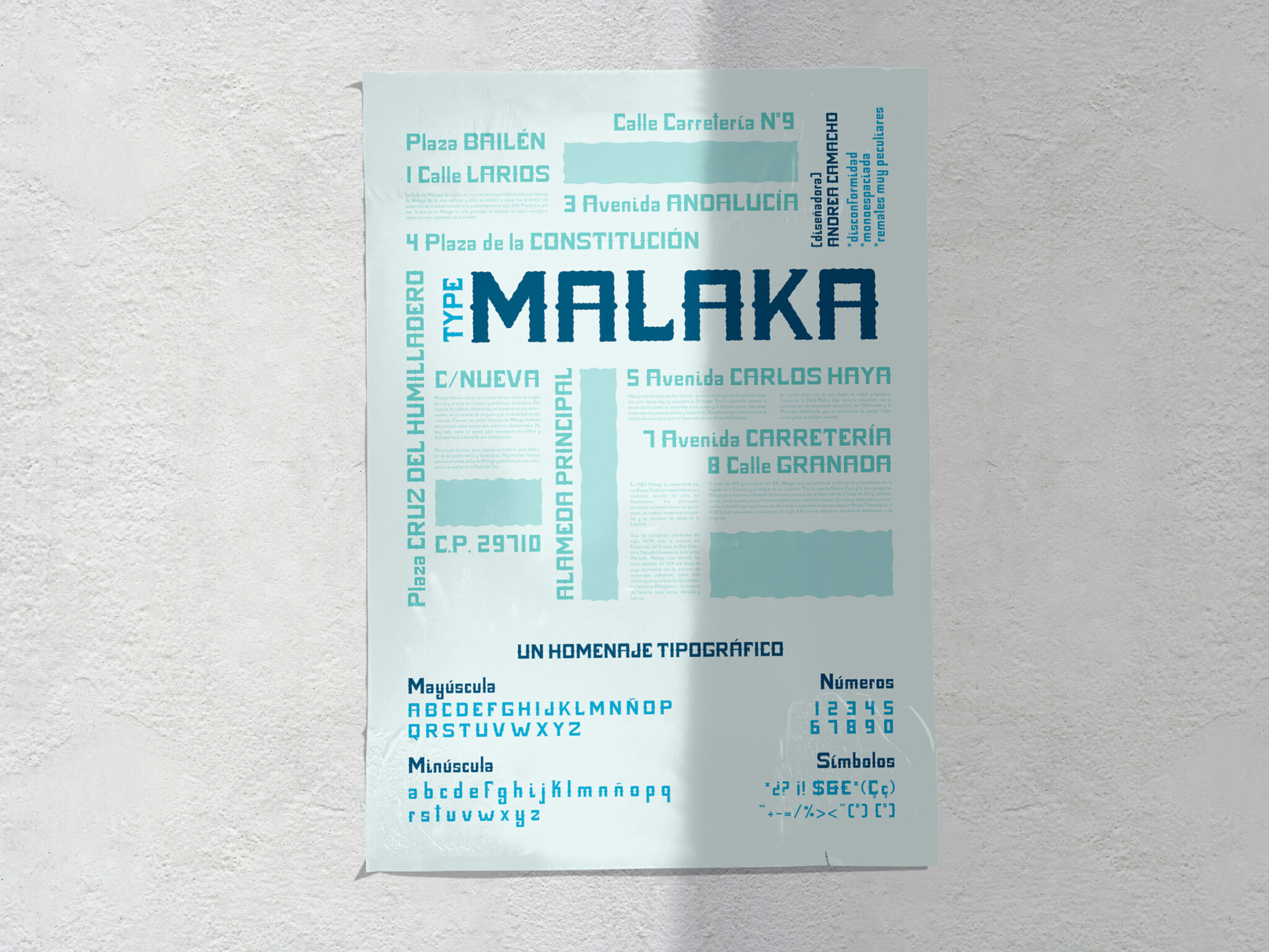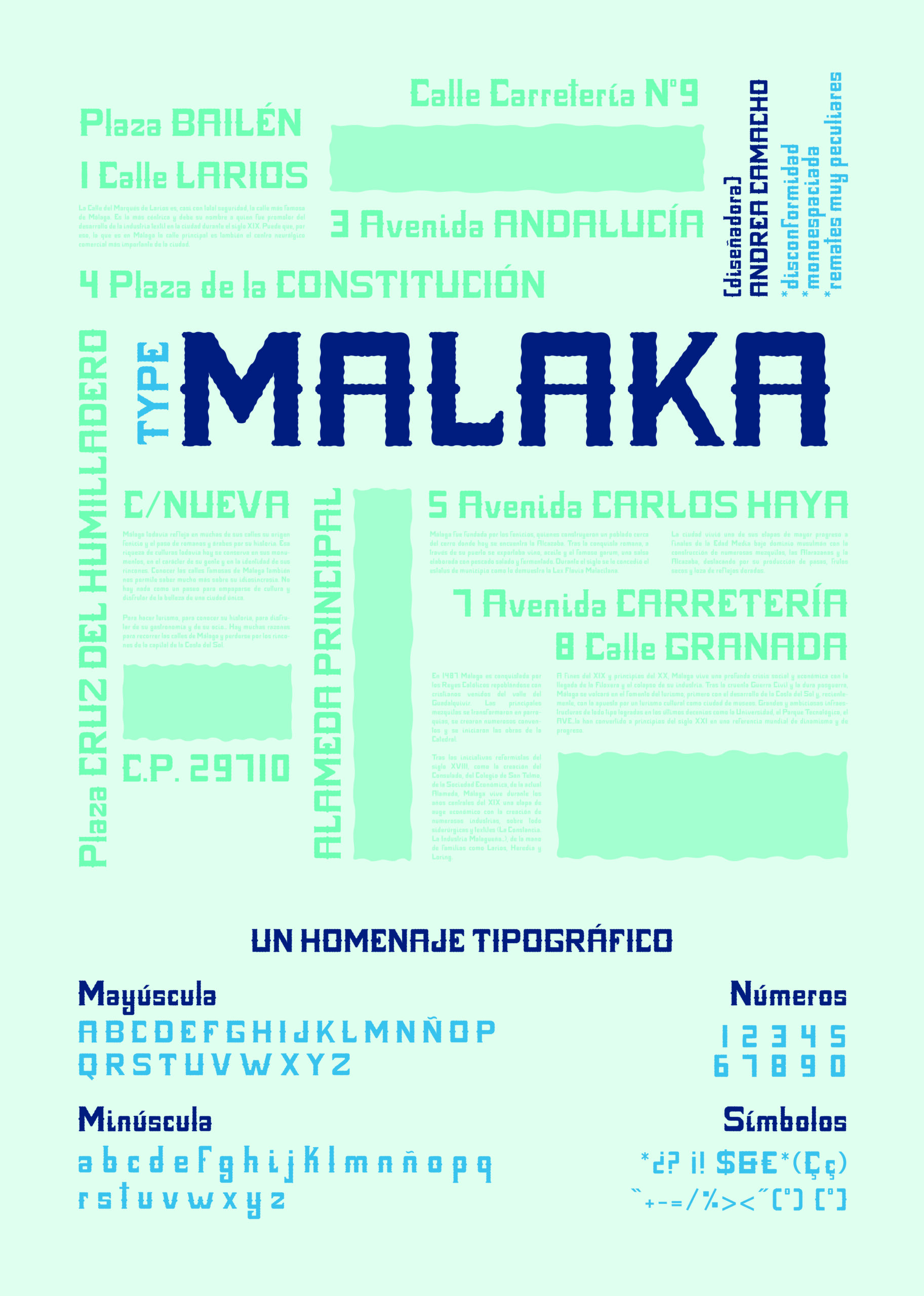 Malaka Type es una tipografía que rinde homenaje a la historia visual y cultural de la ciudad de Málaga. Inspirada en la antigua rotulación cerámica que se utilizaba en las calles malagueñas, esta tipografía recupera la esencia de aquellos letreros hechos a mano, donde la imperfección y la irregularidad no eran errores, sino parte del carácter único de cada pieza. Así, Malaka Type vuelve a los orígenes, a una estética artesanal que refleja la identidad mediterránea, cálida y genuina de la ciudad.