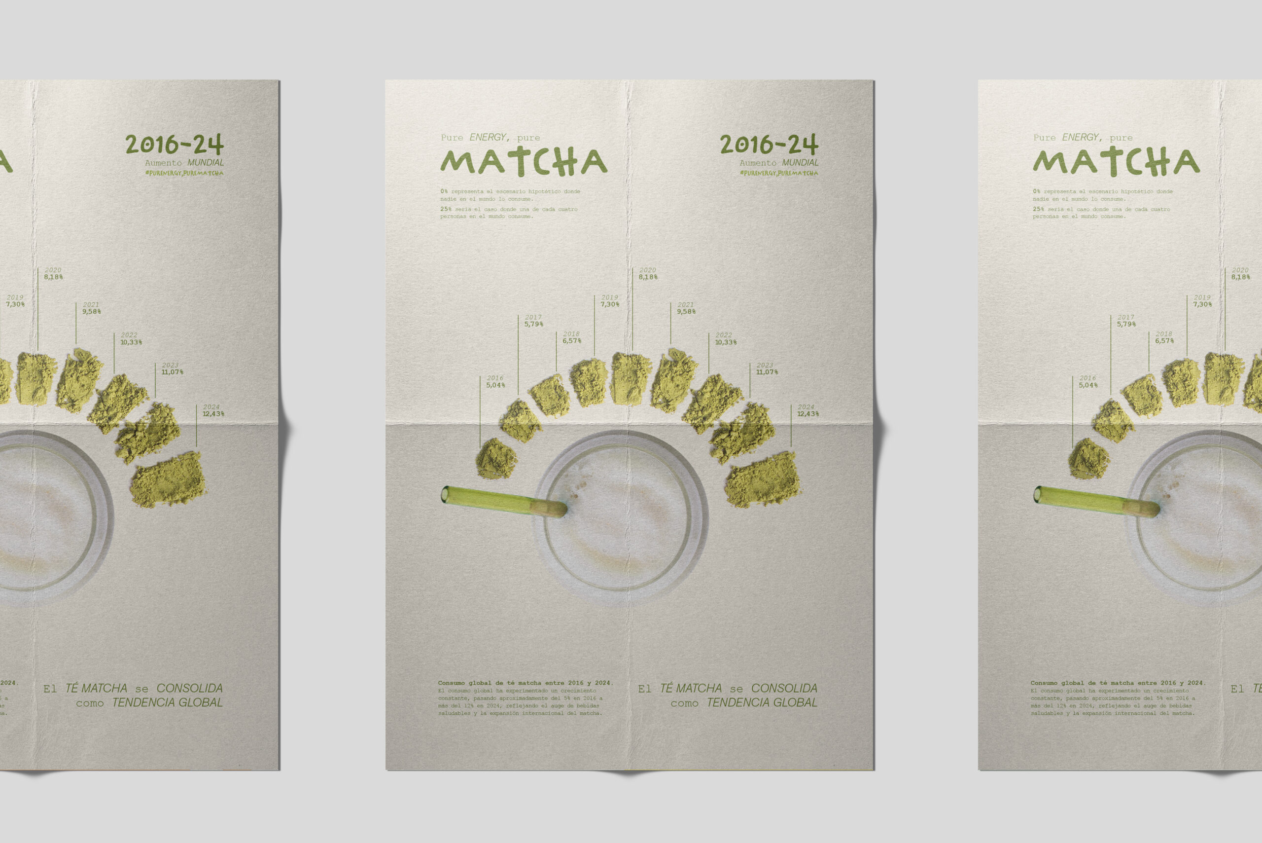 La campaña se basa en dos gráficas y, por consecuente, dos carteles, cada uno abordando un aspecto distinto del consumo de matcha. Ambos soportes mantienen coherencia visual, claridad comunicativa y una jerarquía informativa clara, propia de una campaña unificada.